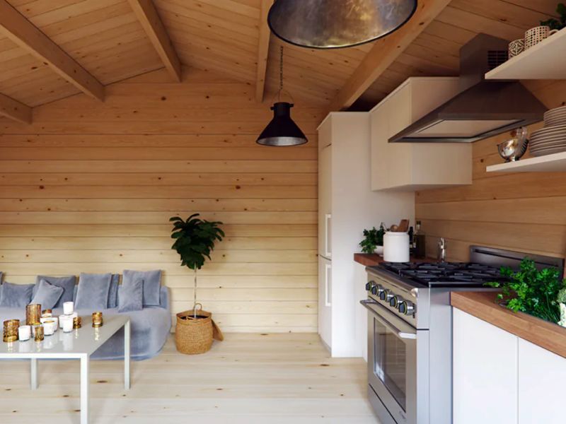 Standardmäßig wird dieses Holzhaus ohne Dachabdeckung geliefert.