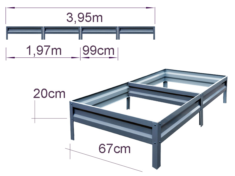 Cinkuota metalinė pakelta lysvė — patvarus sprendimas tvarkingiems aukštoms dobilų ar gėlių lysvėms suformuoti sode arba šiltnamyje. Pagaminta iš cinkuoto metalo, atspari rūdžiui ir išoriniams veiksniams. Unikali gamybos technologija užtikrina tarnavimo laiką ilgiau nei 10 metų.