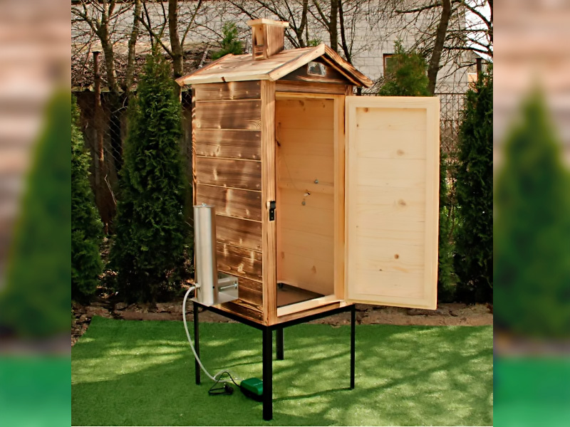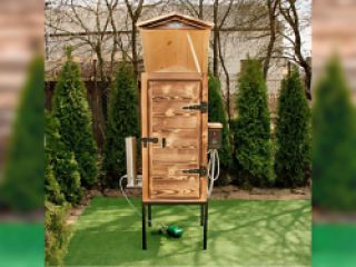 Rūkykla su jumtu ir dūmtraukiu, matmenys 50x50x135 cm, pagaminta iš 20 mm storio Šiaurės šalių egles medienos.