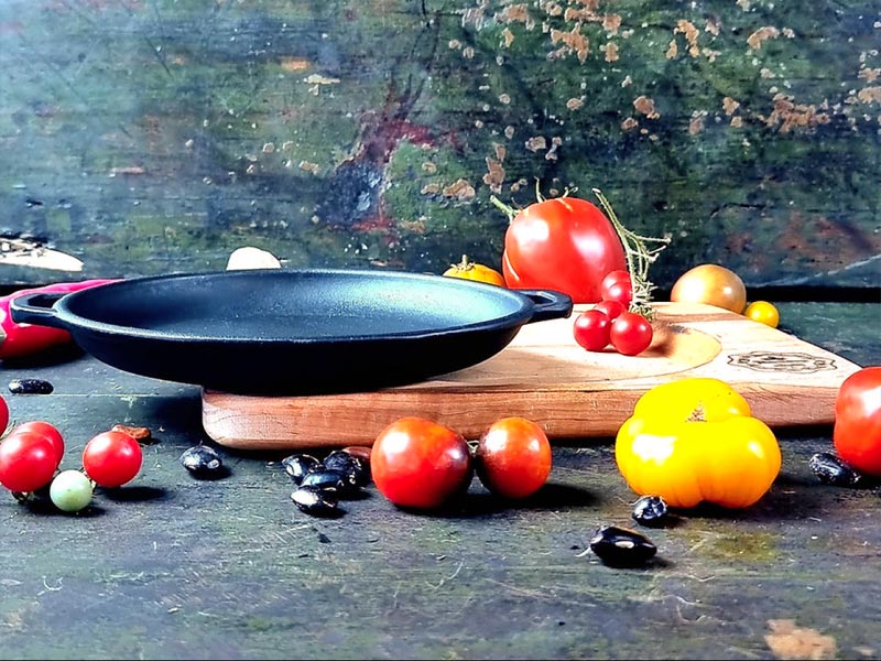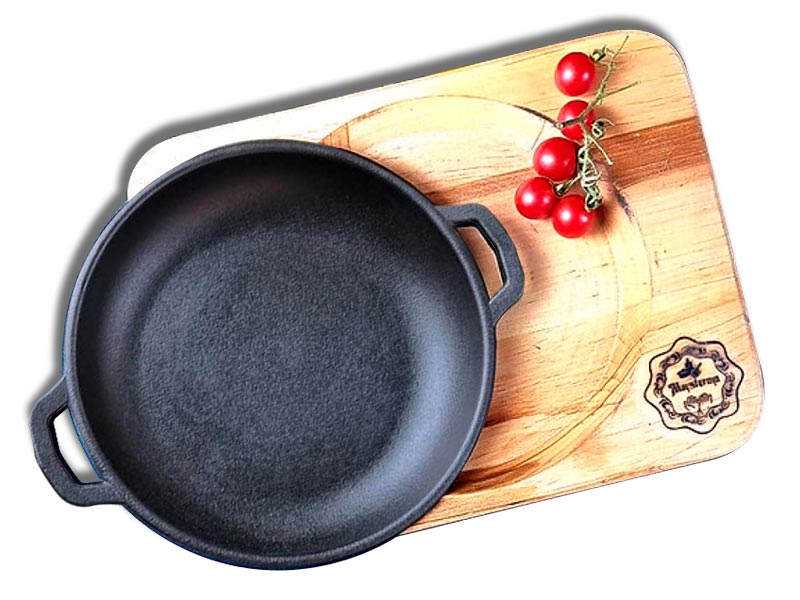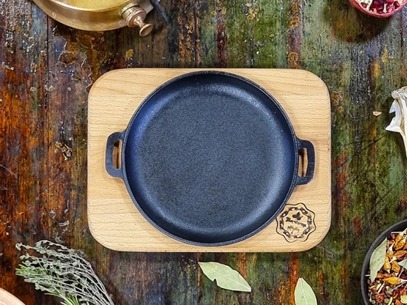Ketaus keptuvė Maysternya Ø18 cm su mediniu padėklu — patvarumas, išbandytas laiku!