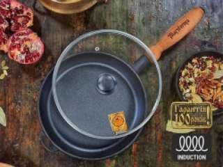 KETAUS KEPTUVĖ-TROŠKINTUVAS MAYSTERNYA Ø26 CM SU MEDINIU RANKENU IR STIKLINIU DANGTELIU (MODELIS T303С3)
