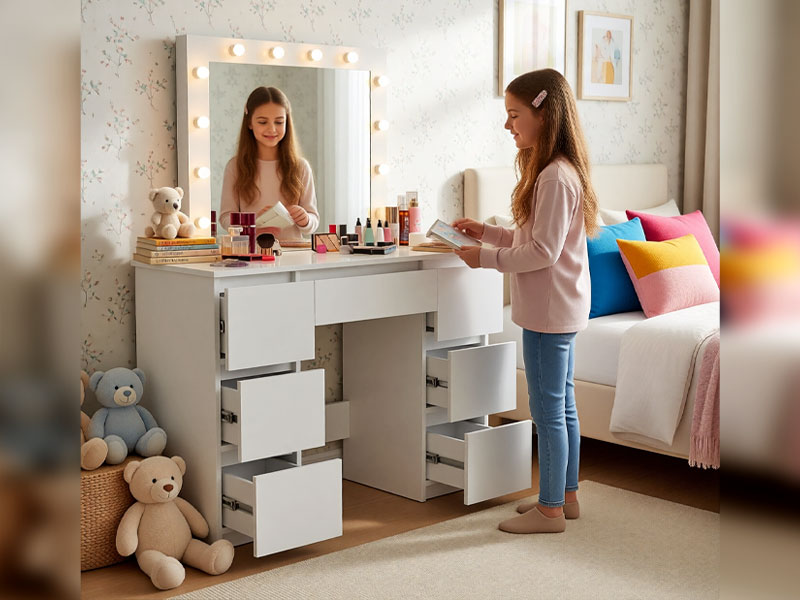 • 2-in-1 funkcionalumas: makiažo staliukas ir laikymo sistema