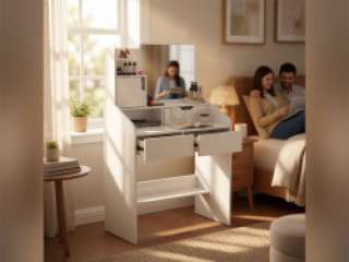 - Patogios lentynos — greita prieiga prie papuošalų, teptukų ir kasdienių priemonių.