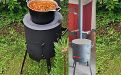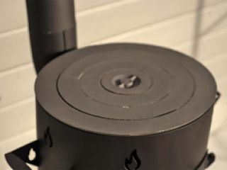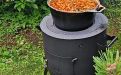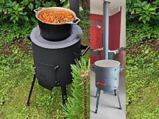 Krosnelė katilui 12L su dūmtraukio vamzdžiu ir ketaus liejinio krosnelės ratu — idealus sprendimas gaminimui lauke.