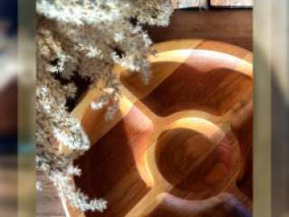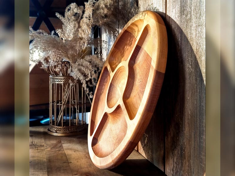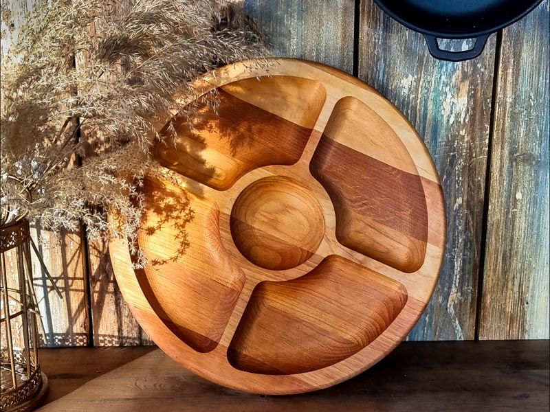 Elegantiška aptarnavimo lentelė su 35 cm skersmeniu – idealus sprendimas stilinguoms užkandžiams, vaisiams, sūriams ir kitiems patiekalams patiekti. Medinė aptarnavimo lentelė pagaminta iš natūralios medienos, turi 5 patogius skyrius ir dvipusę konstrukciją, todėl ypač funkcionali ir praktiška tiek virtuvėje, tiek stalo klotine.