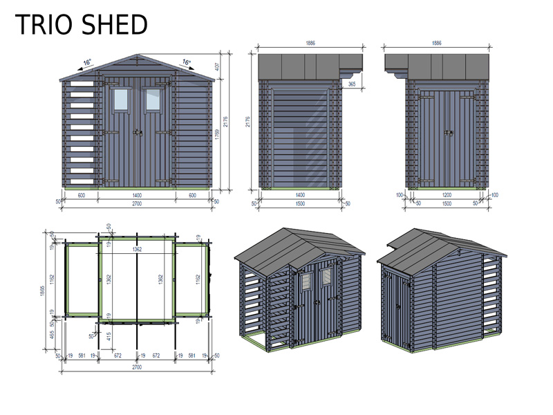 Sodo medinis daiktų sandėliukas (tris dalys) WH-TRIO-2,6x1,4 (Spalva: pilka/impregn. 44.400044)