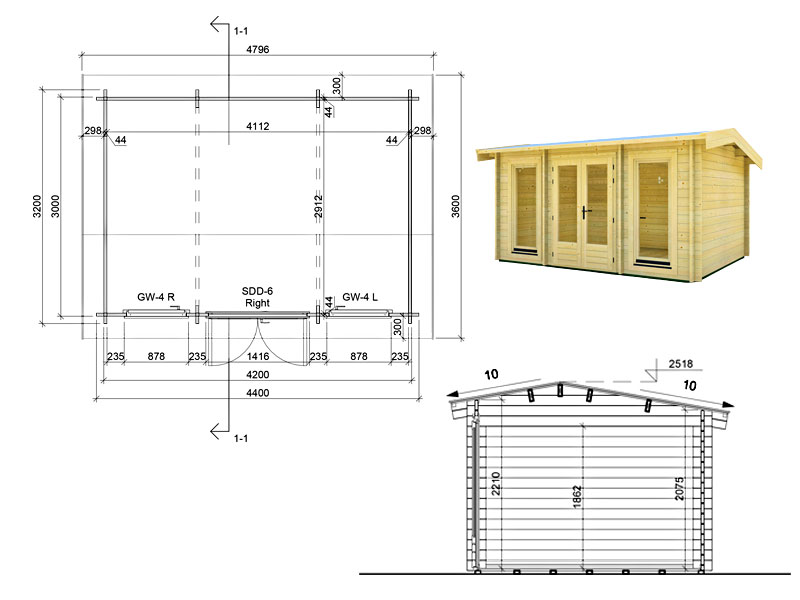 Sienų storis: 44 mm