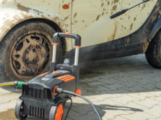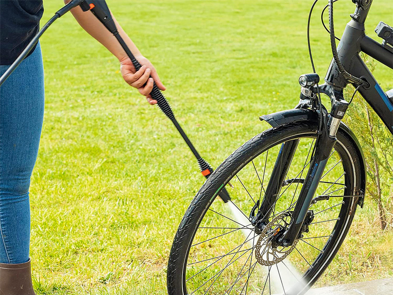 Viegli lietojams: spiediena mazgātājs piedāvā vieglu tīrīšanas uzgaļa nomaiņu. Ir iebūvēti turētāji piederumiem, kabelim un šļūtenei. Ja nepieciešams, mazgāšanas līdzekli var pievienot, izmantojot iebūvēto 0,8 l tvertni (tas notiek ar plakano strūklas sprauslu zema spiediena iestatījumā, t. i., sprauslas uzgalis ir izvirzīts uz priekšu).
