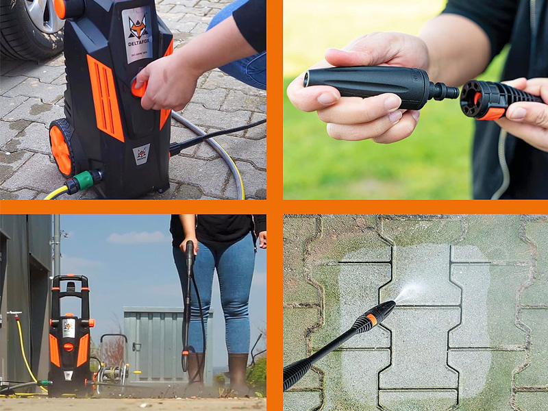 Augsta kvalitāte: spiediena mazgātājs pārsteidz ar jaudīgo alumīnija augstspiediena sūkni, kas nodrošina plūsmas ātrumu līdz 420 l/h un maksimālo spiedienu līdz 420 l/h. 135 bar. Tādējādi spiediena mazgātājs ir ideāli piemērots transportlīdzekļu, terases, fasāžu un daudzu citu objektu tīrīšanai.